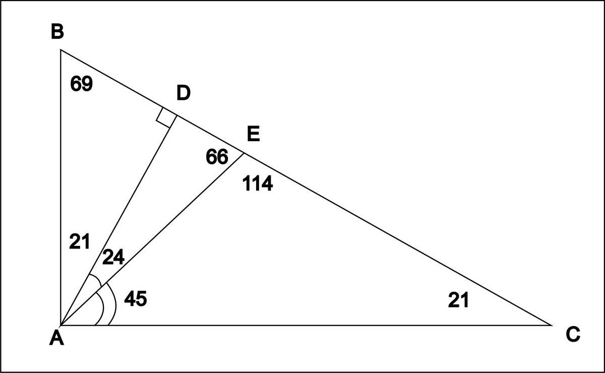 В прямоугольном треугольнике биссектриса и высота, исходящие из вершины прямого угла образуют угол, равный 24градуса.Найти остальные углы треугольника.