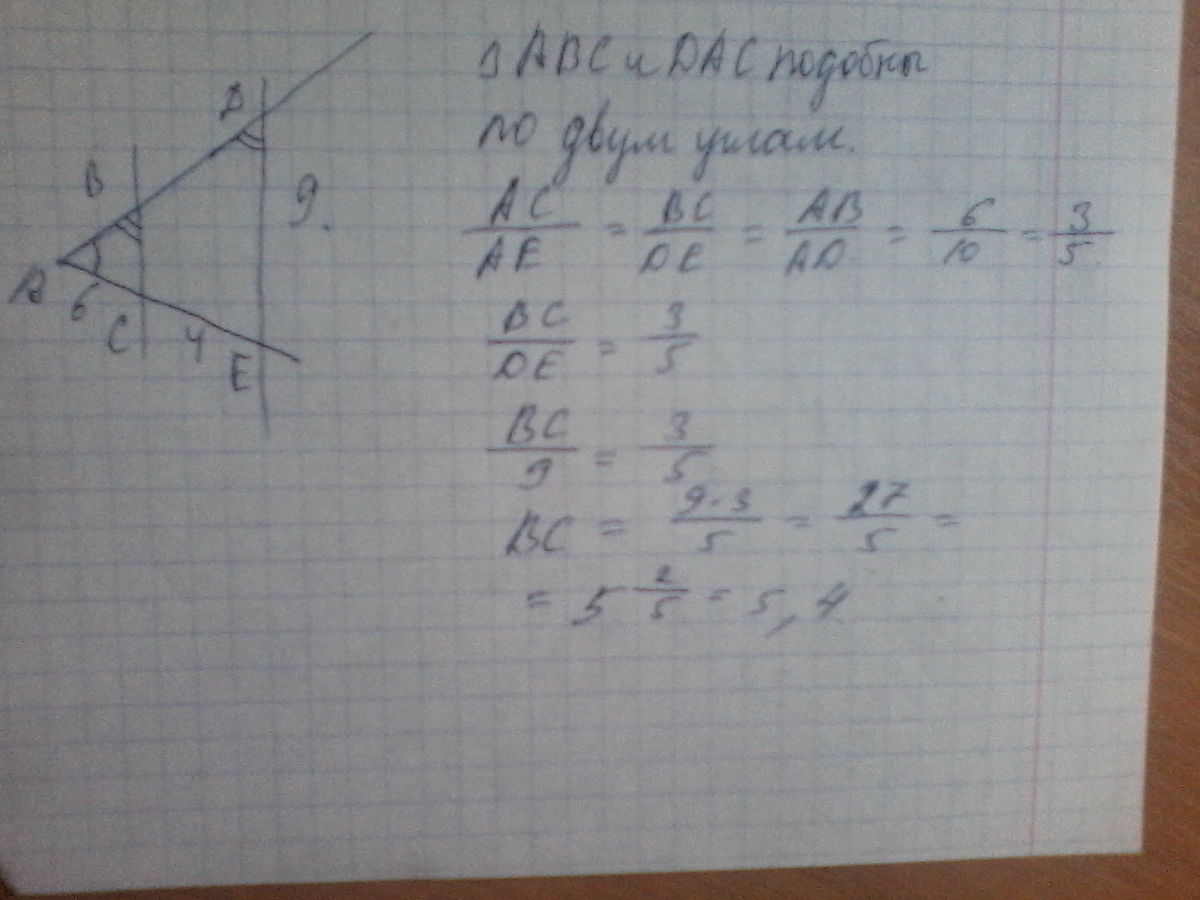 Стороны угла A пересечены паралельными прямыми BC И DE. Найдите BC , если AC = 6, CE= 4, DE = 9.
