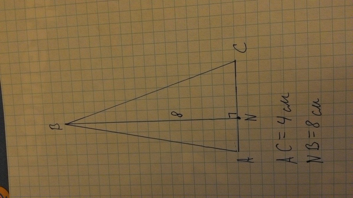 Построй треугольник,у которого одна сторона имеет длину 8см,а высота,проведенная к этой стороне,имеет длину 4см.Сколько см. каждая сторона треугольника?