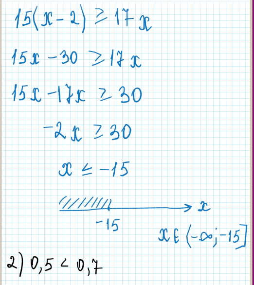 Решите неравенство 15(x-2)>=17x и изобразите на числовой прямой множество его решений)