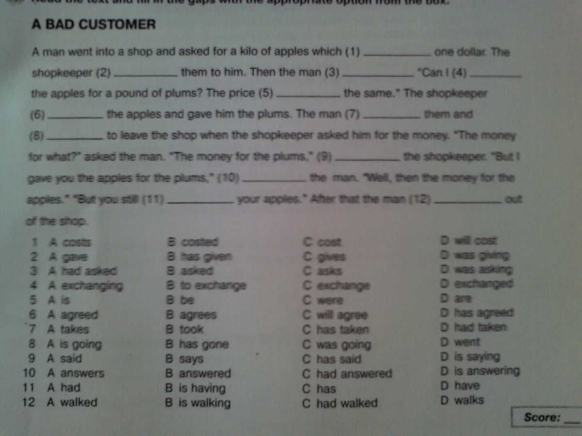 A man went into a shop and asked for a kilo of apples which (1)(costs; costed; cost; will cost) one dollar. The shopkeeper (2)(gave; has given; gives; was giving) them to him. Then the man (3)(had asked; asked; asks; was asking) “Can I (4)(exchanging; to exchange; exchange; exchanged) the apples for a pound of plums? The price (5)(is; be; were; are) the same.” The shopkeeper (6)(agreed; agrees; will agree; has agreed) the apples and gave him the plums. The man (7)(takes; took; has taken; had taken) them and (8)(is going; has gone; was going; went) to leave the shop when the shopkeeper asked him for the money. “The money for what?” asked the man. “The money for the plums, “(9)(said; says; has said; is saying) the shopkeeper. “But I gave you the apples for the plums, “(10) answers; answered; had answered; is answering) the man. “Well, then the money for the apples.” “But you still (11) (had; is having; has; have) your apples.” After that the man (12)(walked; is walking; had walked; walks) out of the shop.