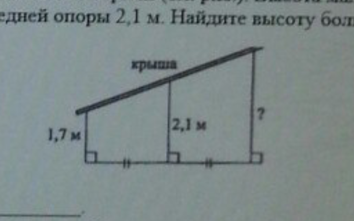 Наклонная крыша установлена в трех вертикальных опорах расположенных на одной прямой. Средняя опора стоит посередине между малой и большой опорами. Высота малой опоры 1.7 м, высота средней опоры 2.1 м. Найдите высоту большей опоры.