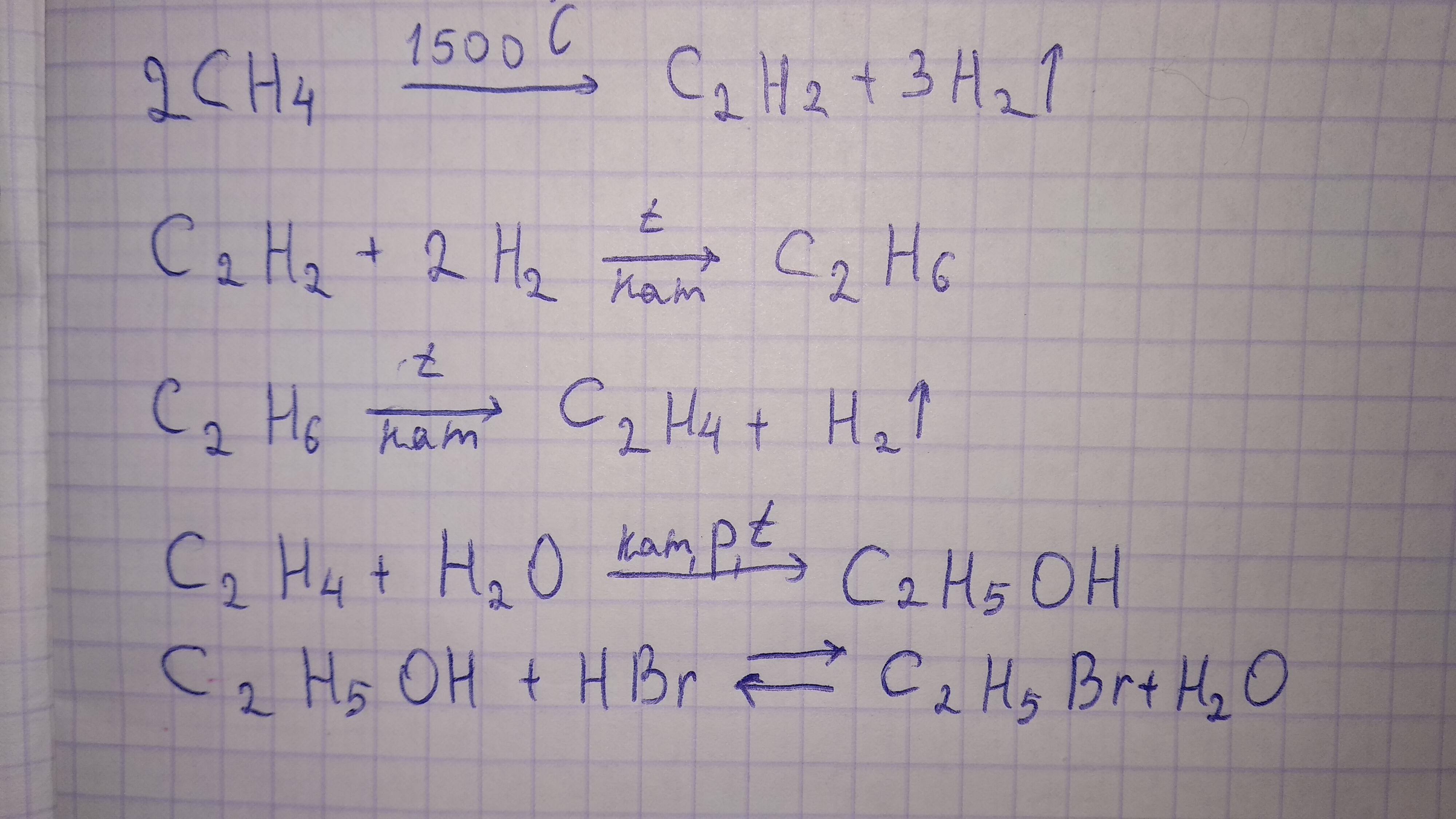 помогите пожалуйста: составьте уравнение реакций в соответствии со схемой превращении CH4-C2H2-C2H6-C2H4-C2H5OH-C2H5Br укажите условия пртекания реакций