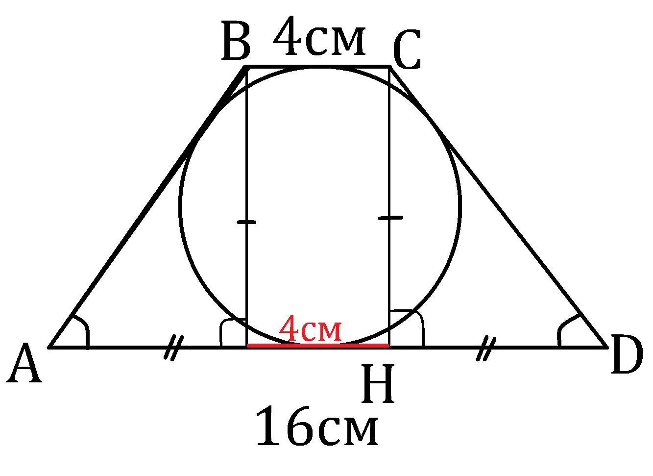 Дана трапеция ABCD, BC║AD. BC=4см, AD=16см, AB=CD. BC+AD=AB+CD (если четырёхугольник можно описать около окружности, то суммы противоположных сторон равны).