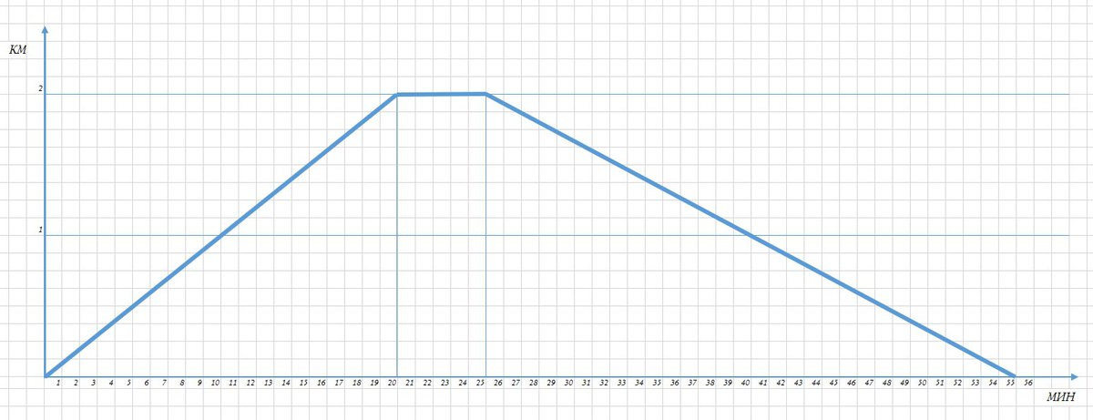 Девочка вышла из дому и шла по направлению к школе 20 минут, затем она остановилась в пункте А и любовалась цветком 5 минут, а потом вернулась домой за 30 минут. Нарисовать график изменения расстояния девочки от дома по времени, если от дома до пункта А 2 км.