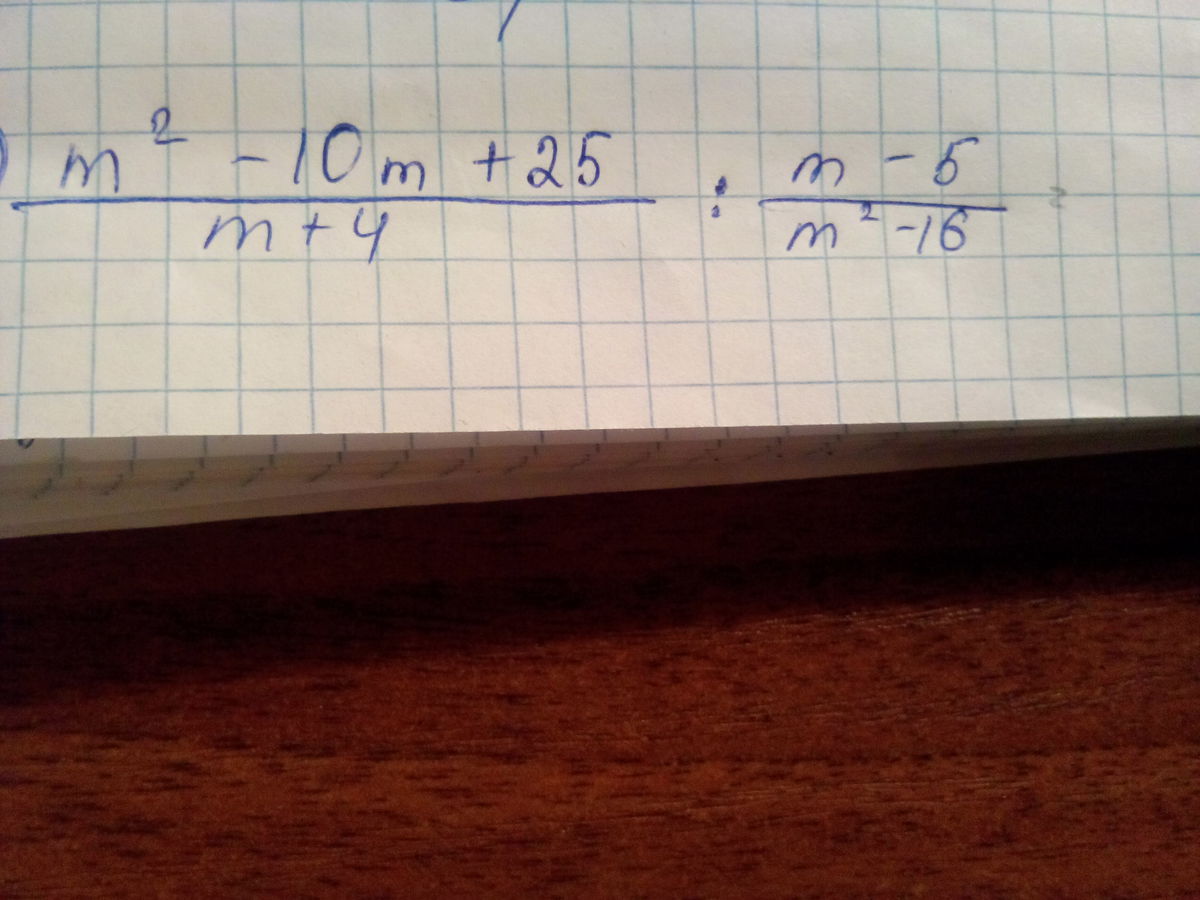 \frac{m^2-10m+25}{m+4}: \frac{m-5}{m^2-16}= \frac{(m-5)^2}{m+4}* \frac{(m-4)(m+4)}{m-5}=(m-5)(m-4)= \\ m^2-5m-4m+20=m^2-9m+20