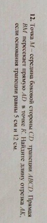 <CBM=<DKM накрест лежащие,<CMB=<DMK вертикальные⇒<MCB=<MDK U CM=DM⇒ΔCMB=ΔDMK⇒BC=DK=5