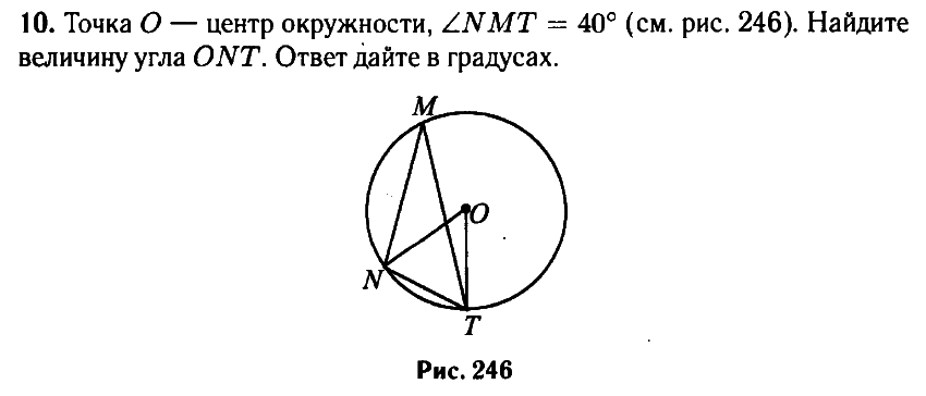 Угол NMT-вписанный, равняется 1/2 дуги на которую он опирается, дуга NT=40x2=80, угол NOT-центральный, следовательно равен дуге на которую он опирается, угол NOT=80, треугольник NOT-равнобедренный(NO=OT-радиусы), следовательно угол ONT=(180-80):2=50