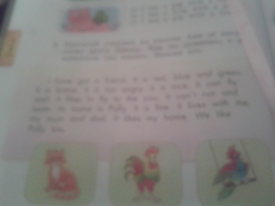 У меня есть друг. Он красного, голубого и зеленого цветов. Он храбрый, не злой. Он красивый и хорошо летает. Ему нравится летать в зоопарка. Он не может бегать и плавать. Его(ее) имя Полли. Ему пять. Он живкт со мной, моими мамой и папой. Ему нравится наш дом. Нам тоже нравится Полли.