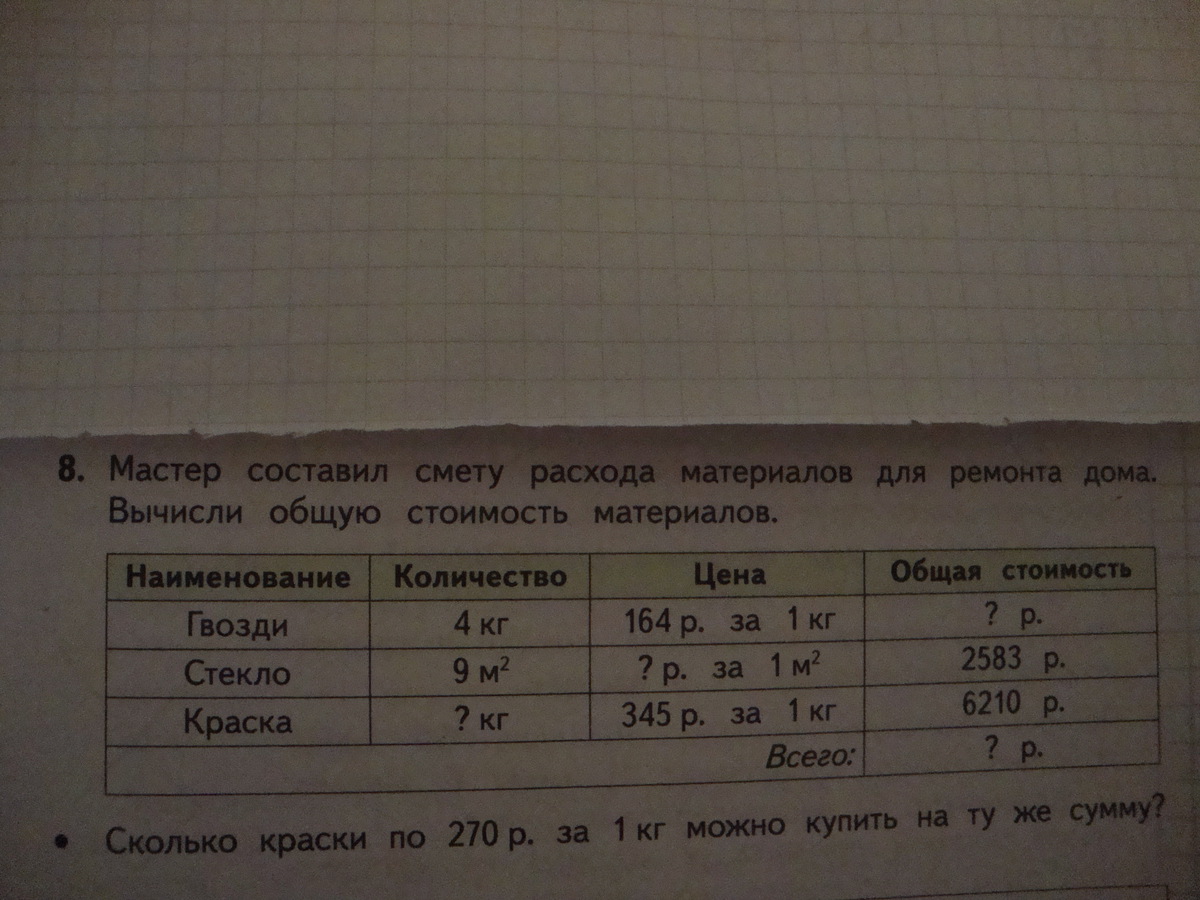 1). Гвозди . 164*4=656 (руб) общая стоимость. 2). Стекло. 2583:9=287 (руб) за 1 м/кв. 3). 6210:345=18 (кг) количество. 4). 656+2583+6210+287=9736 (руб) всего.