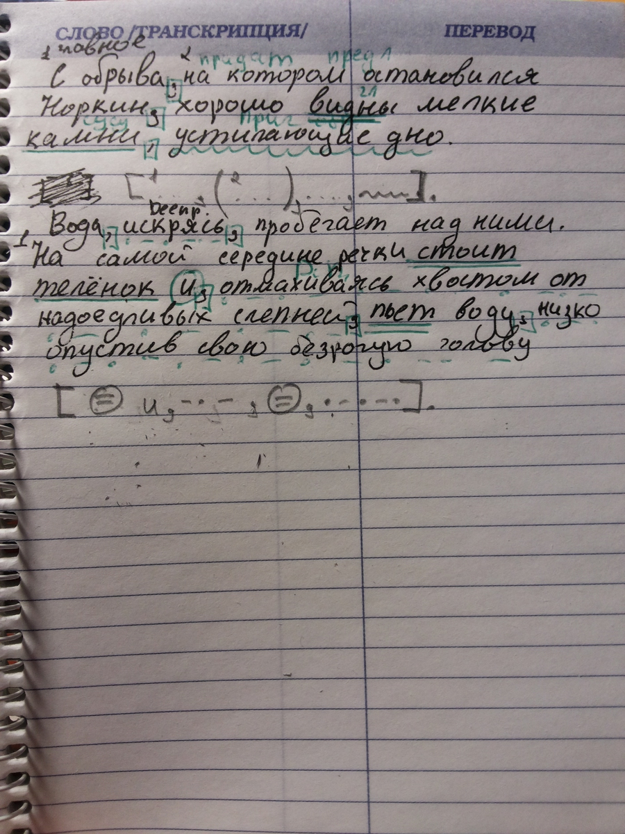 С обрыва, (1) на котором остановился Норкин, (2) хорошо видны мелкие камни, (3) устилающие дно. Вода, (4) искрясь, (5) пробегает над ними. На самой середине речки стоит теленок и, (6) отмахиваясь хвостом от надоедливых слепней, (7) пьет воду, (8) низко опустив свою безрогую голову. (Селянкин О.)