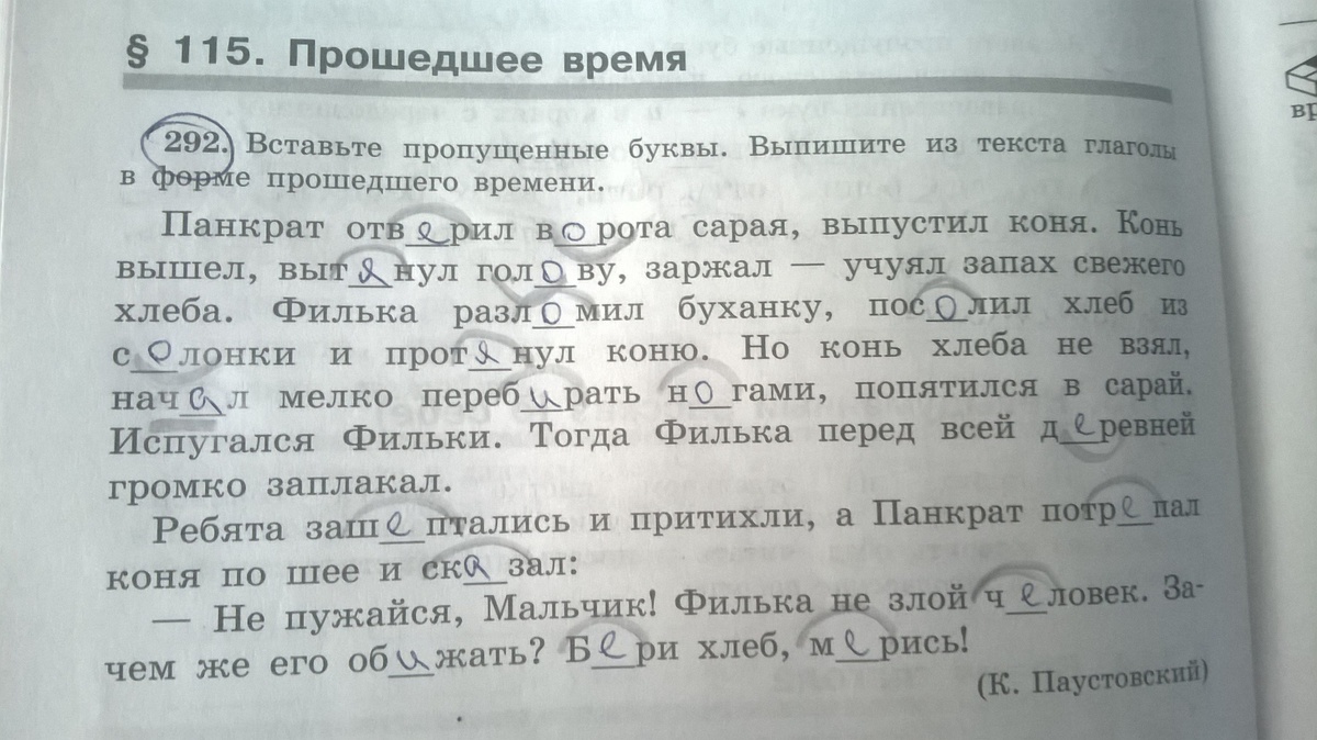 Глаголы прошедшего времени:Отворил, выпустил, вышел, вытянул, заржал, учуял, разломил, посолил, протянул, взял, начал, попятился, испугался, заплакал, зашептались, притихли, потрепал, сказал.