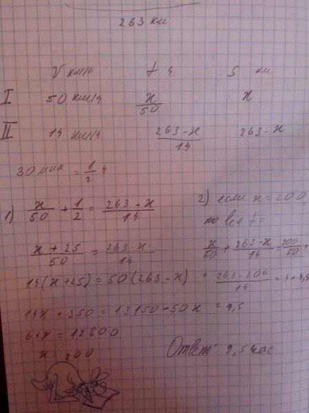 Мотоциклист ехал по шоссе со скоростью 50 км/ч, а оставшийся путь по проселочной дороге со скоростью 14 км/ч. Весь путь составил 263 км. Сколько времени затратил мотоциклист на весь путь , если по проселочной дороге он ехал на 30 минут дольше, чем по шоссе.