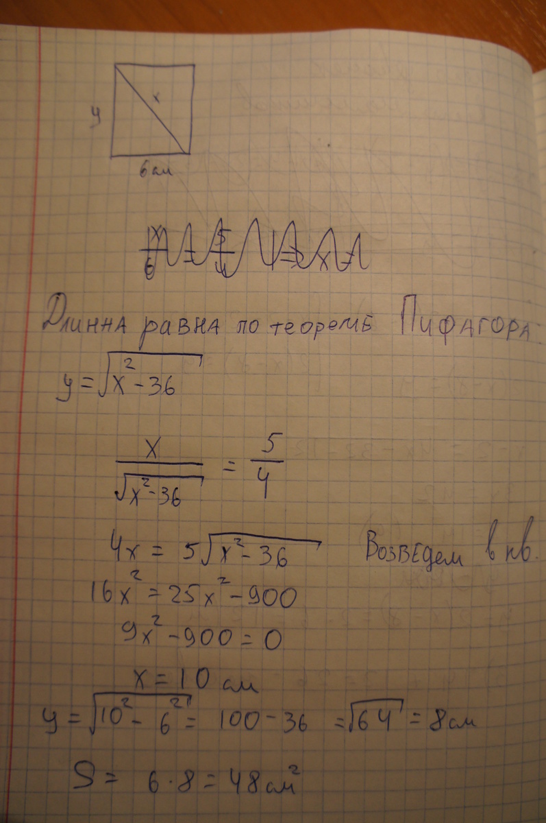Отношение диагонали прямоугольника к его длине равно 5:4. Ширина прямоугольника 6 см. Найдите его площадь.