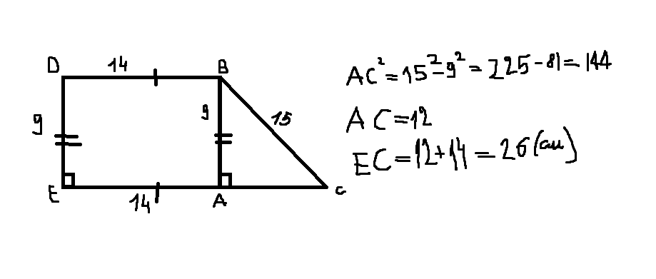 В прямоугольной трапеции боковые стороны равны 9 см и 15 см, а меньшее основание - 14 см. Найдите большее основание.