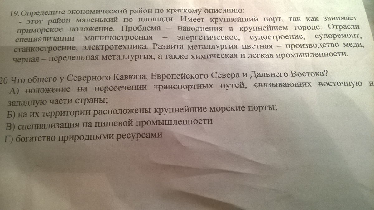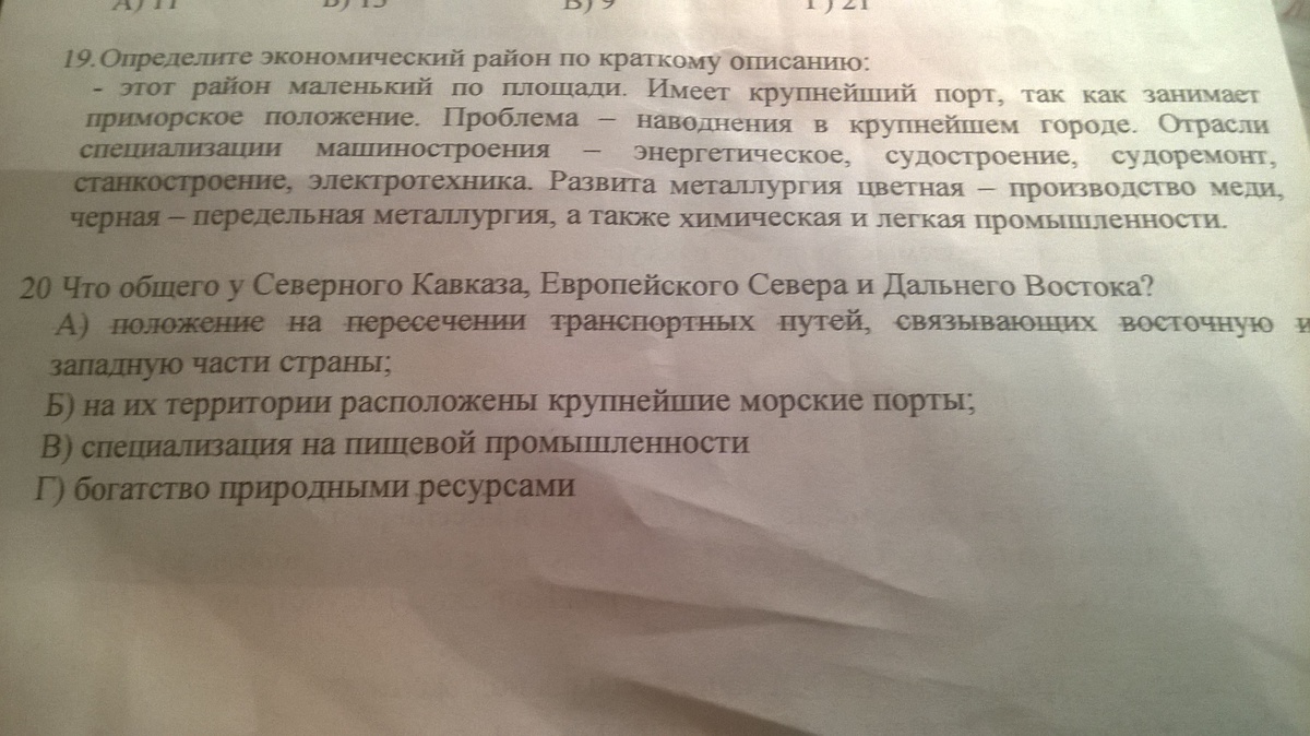 7 - а) Ростов-на-Дону, 9 - б) Западно-Сибирская, 10 - б) Север России, Норильск, 11 - б) вблизи от источников сырья, 19 - Северо-Кавказский, 20 - вообще подходят и б) крупнейшие порты и г) богатство природными ресурсами, но я думаю, что всё-таки б).
