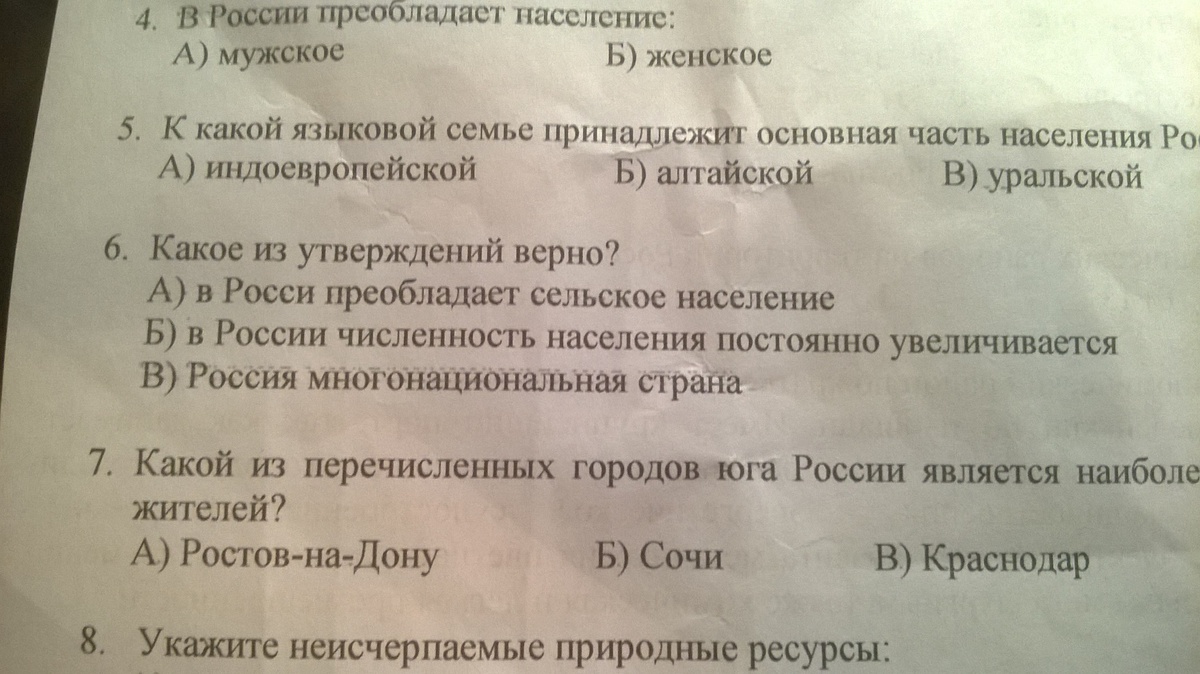 4 - б) женское, 5 - а) индоевропейская, 6 - тут подходят и б)численность населения постоянно увеличивается (сейчас да, а вот некоторое время назад - нет, и к этому можно придраться), и в)Россия - многонациональная страна, но я думаю, что всё-таки в)....