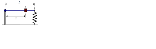 Один любознательный школьник построил у себя во дворе установку для изучения колебаний (см. рисунок). Легкая штанга длиной L=1,5м левым концом закреплена в шарнире, который может вращаться без трения вокруг горизонтальной оси, а правым опирается на пружину жесткостью k=800Н/м. На штанге закрепляется небольшой по размерам груз массой m=18кг, причем положение пружины регулируется так, что при любом размещении груза на штанге(то есть при любомx) в положении равновесия штанга горизонтальна. Школьник исследовал зависимость периода малых колебаний штанги с грузом от величины x. Определите разность периодов колебаний ∆T≡T1 −T2 , если 1x1 =м, а 0,5 x2 =м. Ответ приведите в миллисекундах, округлив до целого значения.