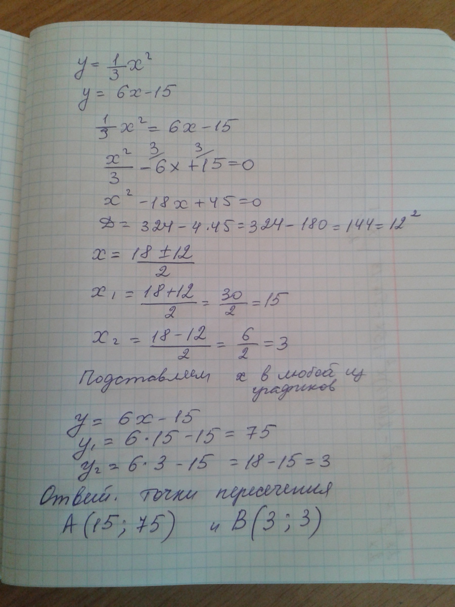 и прямая y=6x-15. Если точки пересечения существуют, то найдите их координаты.