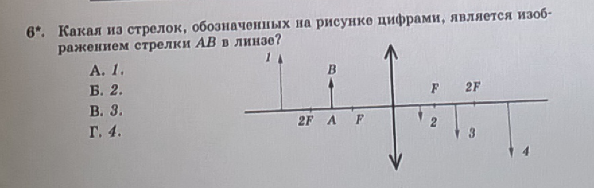 Какая из стрелок,обозначенных на рисунке цифрами, является изображением стрелки АВ в линзе?