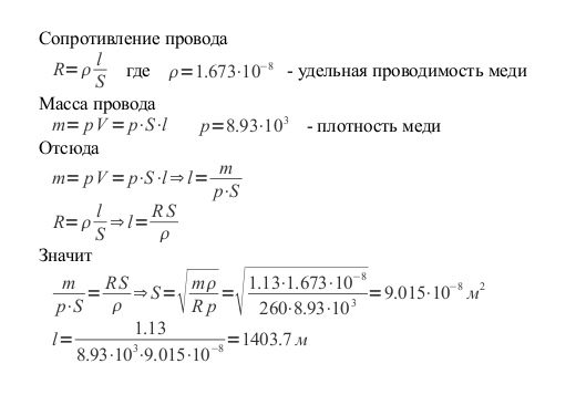 Катушка медной проволоки массой 1,13 кг имеет сопротивление 260 Ом. Определите длину и диаметр проволоки.