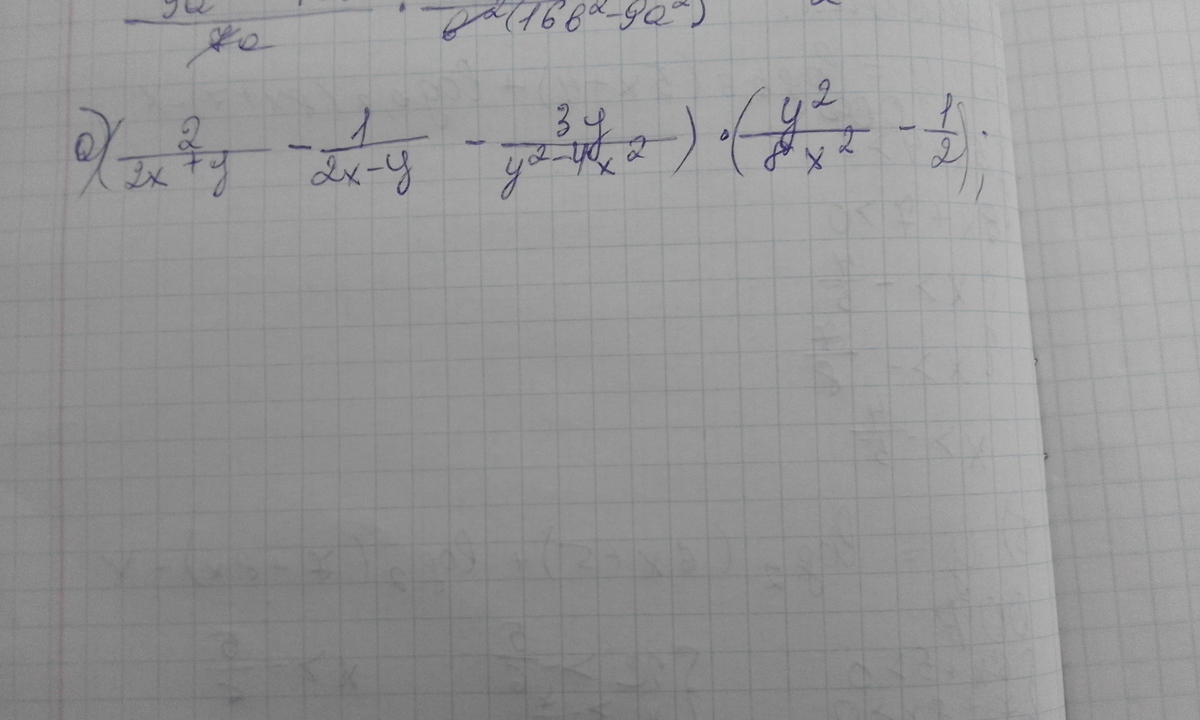 (\frac{2}{2x+y}- \frac{1}{2x-y}- \frac{3y}{y^2-4x^2})*( \frac{y^2}{8x^2}- \frac{1}{2})=( \frac{2(2x-y)-(2x+y)}{4x^2-y^2}+ \frac{3y}{4x^2-y^2})* \\ ( \frac{y^2}{8x^2}- \frac{1}{2})= \frac{4x-2y-2x-y+3y}{4x^2-y^2}*( \frac{y^2}{8x^2}- \frac{1}{2})= \frac{2xy^2}{(4x^2-y^2)8x^2}- \frac{2x}{2(4x^2-y^2}= \\  \frac{y^2}{4x(4x^2-y^2)}- \frac{2x}{2(4x^2-y^2)}= \frac{y^2-2x*2x}{4x(4x^2-y^2}=- \frac{4x^2-y^2}{4x(4x^2-y^2)}=- \frac{1}{4x}