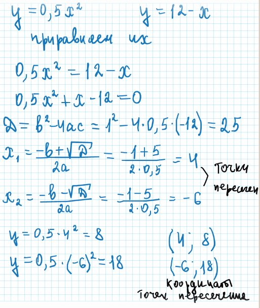 Не выполняя построения, определите, пересекаются ли парабода y=0,5x^2 и прямая y=12-x. Если точки пересечения существуют, то найдите их координаты.