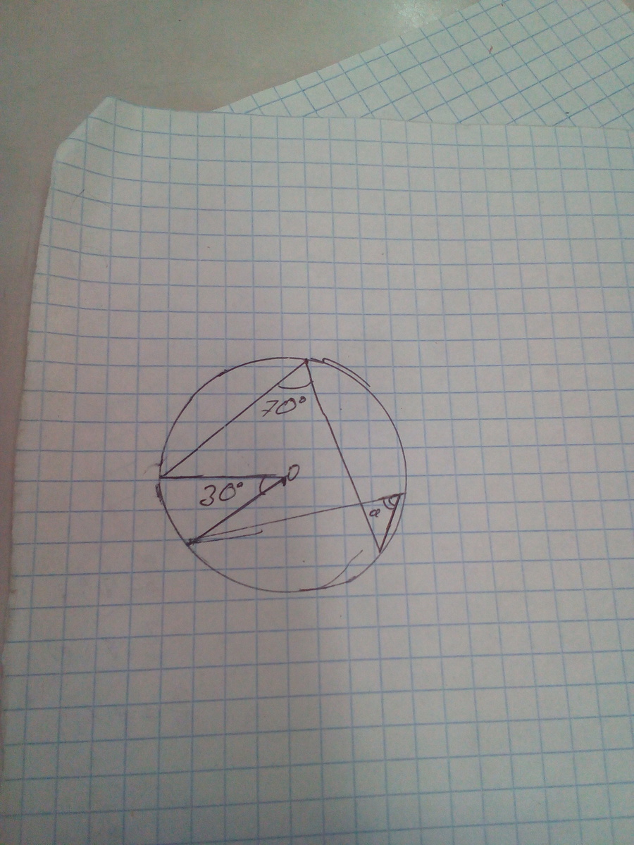 Этот угол будет равен 55, т.к. Угол в 70 градусов вписанный, значит дуга на которую он опирается будет в 2 раза больше и равна 140, дуга на которую опирается угол в 30 градусов будет равна 30,т.к.угол центральный, а дуга на которую опирается угол а = 140-30=110, но угол а является вписанным, значит он равен половине дуги на которую опирается и равен 55.