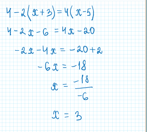 Решить уравнение 4-2(x+3)=4(x-5)