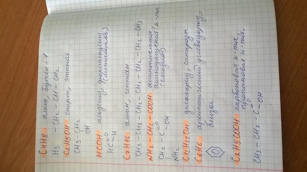 C₄H₈,C₂H₅OH,HCOH,C₇H₁₆,NH₂-CH₂-COOH,C₁₂H₂₂O₁₁,C₆H₆,C₂H₅COOH.