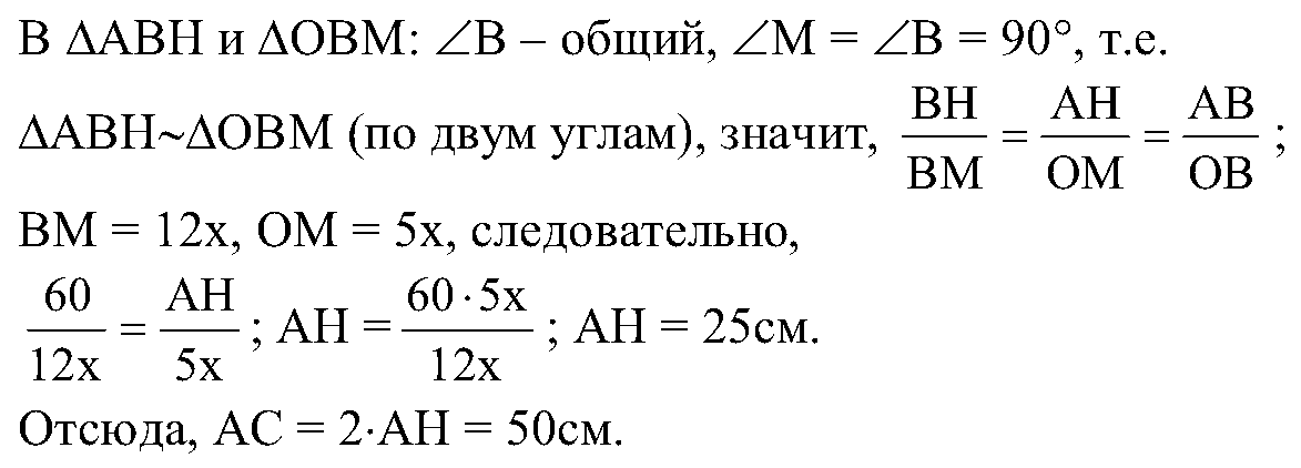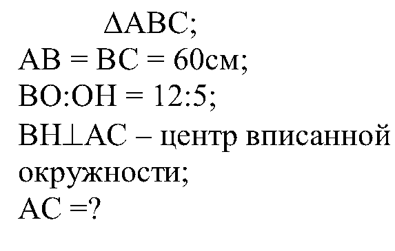 найдите основание равнобедренного треугольника, если центр вписанной в него окружности делит высоту, в отношении 12:5, считая от вершины, а боковая сторона равна 60 см.