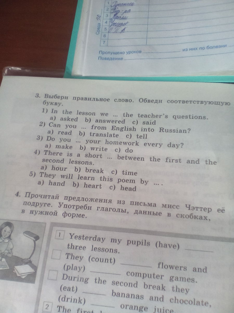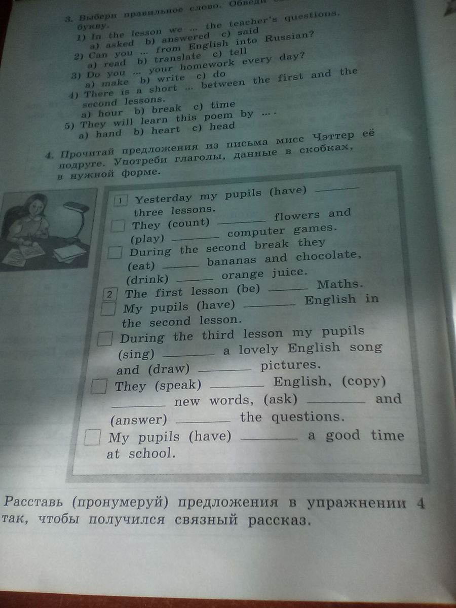 the second break they ate bananas and chocolate, drank orange juice. During the third lesson my pupils sang a lovely English song and drew picturies. My pupils had a good time at sschool. -предложения в правильном порядке расставила и вставила глаголы.