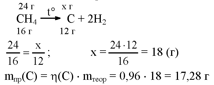 Какая масса сажи образуется при разложении метана массой 24 г ? Массовая доля выхода продукта составляет 96%.
