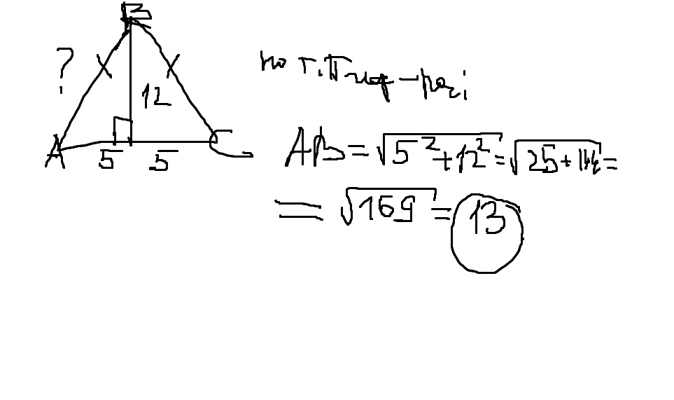 в равнобедренном треугольнике основание равно 10 см а высота проведённая к основанию равна 12 см вычислите боковую сторону треугольника