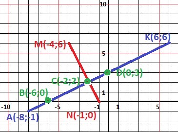 1. На координатной плоскости постройте отрезок MN и прямую АК, если М (–4; 6), N (–1; 0), А (–8; –1), К (6; 6). Запишите координаты точек пересечения прямой АК с построенным отрезком и осями координат.
