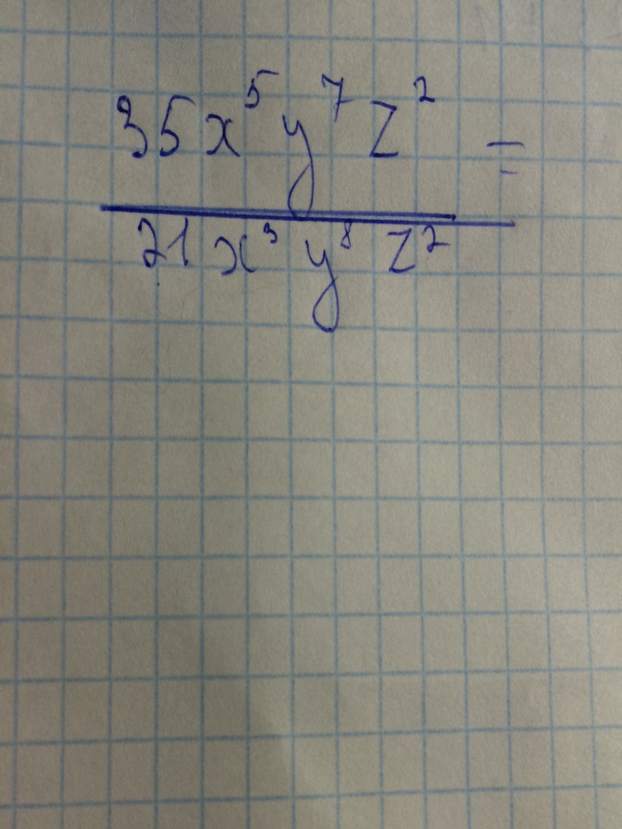 \frac{35x^{5} y^{7} z^{2}   }{25 x^{3} y^{8}  z^{2}   } = \frac{5 x^{2} }{3y}