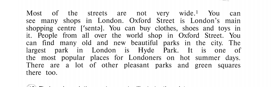 В Лондоне ты найдешь некоторые из лучших театров, кинотеатров и музеев. В Лондоне также много красивых старых церквей. В Лондоне около десяти тысяч улиц. Большинство из них не очень широкие. Ты можешь найти много магазинов в Лондоне. Главный центр шоппинга в Лондоне - Оксфорд стрит. На ней ты можешь купить одежду, обувь и игрушки. Люди со всего мира занимаются шоппингом на Оксфорд стрит. Ты можешь найти множество старых и новых красивых парков в городе. Самый большой парк Лондона - Хайд парк. Это одно из самых популярных мест для жителей Лондона в жаркие летние деньки. Здесь также много других приятных парков и зеленых площадей.