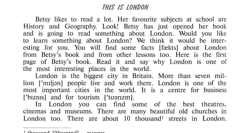 Бэтси очень любит читать. Ее любимые предметы в школе - история и география. Смотри! Бэтси только что открыла свою книгу и собирается прочитать о Лондоне. Хочешь узнать что-то о Лондоне? Мы думаем, тебе будет это интересно. Ты узнаешь о Лондоне из книги Бэтси и на других уроках тоже. Вот первая страница книги Бэтси. Прочитай ее и скажи, почему Лондон - один из самых интересных мест в мире.