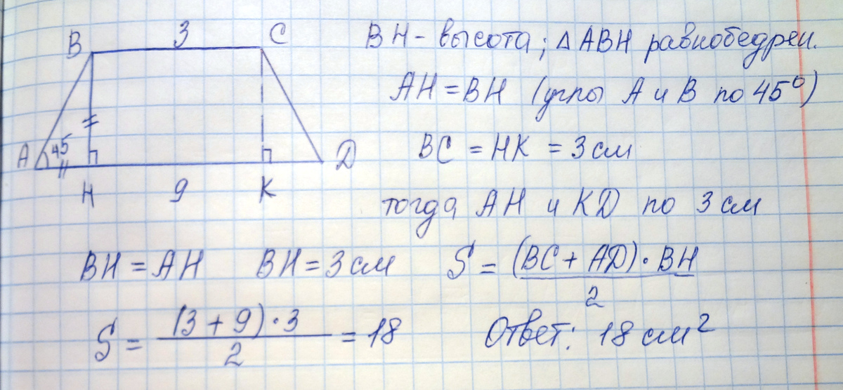 В равнобедренной трапеции основания равны 3 и 9, а один из углов между боковой стороной и основанием равен 45 градусов. Найти площадь трапеции. Помогите пожалуйста!
