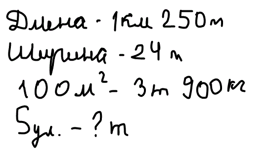 улицу в длинной 1км 250м и шириной 24м покрыли асфальтом. на каждые 100м2 расходовали 3т 900кг асфальта сколько всего тонн асфальто израсходовали