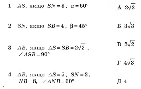Установите соответствие между длинами отрезков(1-4) и их числовыми значениями(А-Д),если SN перпендикулярна плоскости Y(гама)