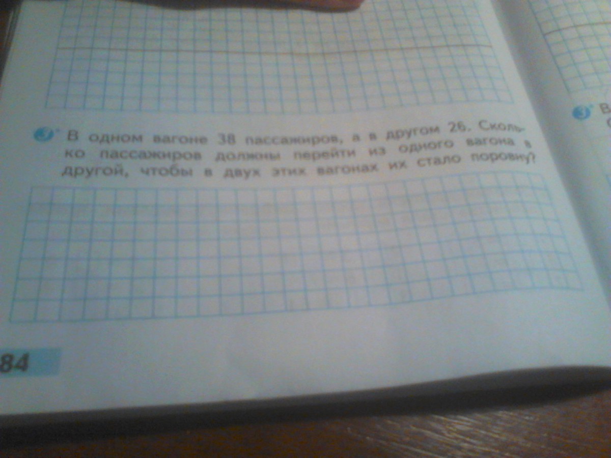 в одном вагоне 38 пассажиров, а в другом 26. Сколько пассажиров должно перейти из одного вагона в другой, чтобы в двух этих вагонах их стало поровну