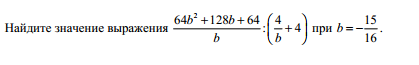 Сначала упростим исходное выражение: (64*b²+128*b+64):b : (4:b+4)= (8*b+8)²:b : ((4+4*b):b)= 8²*(b+1)²:b * b:(4*(b+1))= 16*(b+1). Теперь подставим нужное значение b. 16*(-15:16 + 1)= -15 + 16=1.