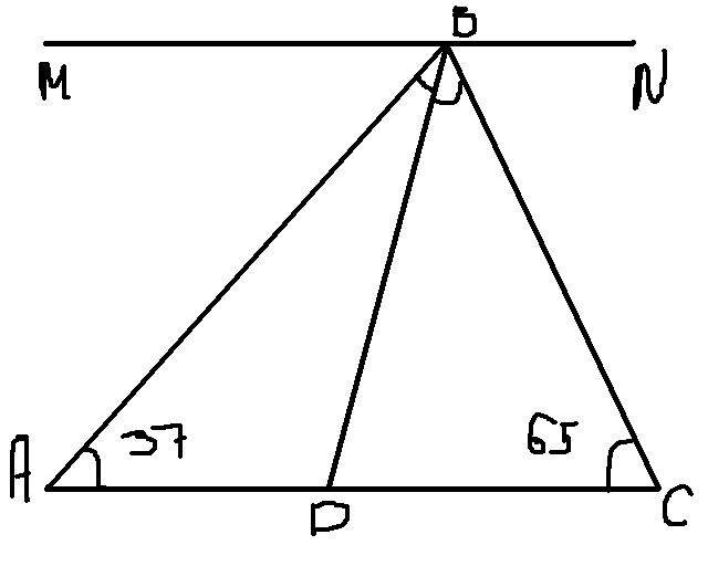 Черти картину: Треугольник АВС (В наверху), ВД - биссектр.,отмечай равные углы, MN || AC, уг А = 37*, уг С= 65*. Пиши Дано. (переписывай тоже самое)