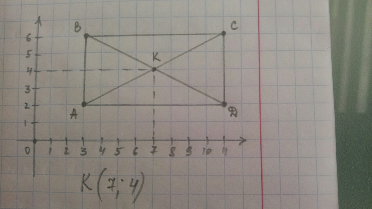 построй прямоугольник abcd по координатам вершин:A(3;2)B(3;6)c(11;6)d(11;2)Проведи диагонали ас и вd прямоугольника и найди координаты их точки пересечения К