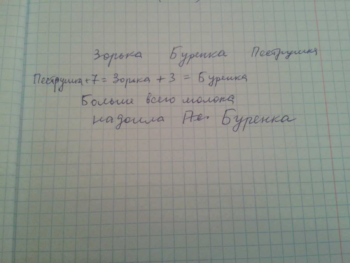 Корова Зорька надоила молока на 3 л меньше Буренки, но на 7 л больше Пеструшки. Какая корова надоила больше молока?