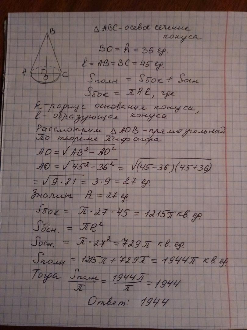высота конуса равна 36 ,образующая равна 45 найдите площадь его полной поверхности деленную на π