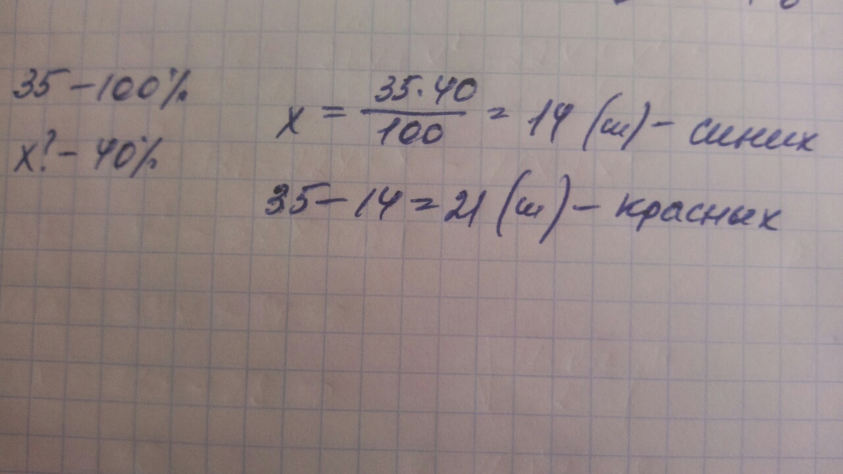 35*60%=35*60/100=35*6/10=35*3/5=21 красный шар