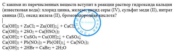 С какими из перечисленных веществ вступит в реакции раствор гидроксида кальция (известковая вода): хлорид цинка, железо, оксид серы (IV), сульфат меди (II), нитрат свинца (II), оксид железа (II), бромоводородная кислота?