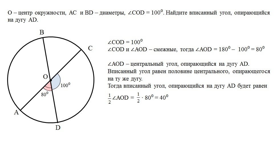 На рис.180 точка О - центр окружности,АС и BD - диаметры, угол COD = 100 градусов.Найдите вписанный угол,опирающийся на дугу AD